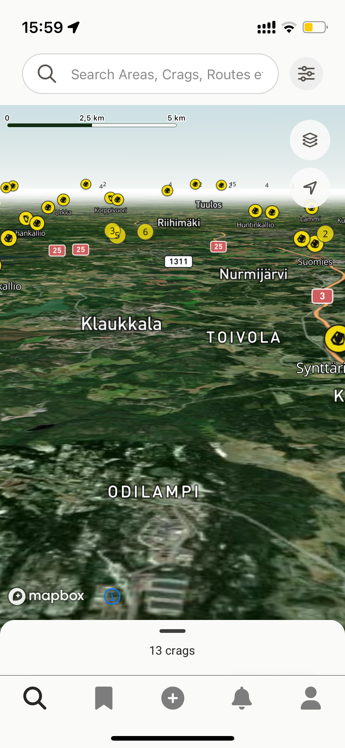 the number of crags that it shows in the area (above the toolbar) doesnt make sense when I choose the 3D satellite map and tilt the map.. only a minor issue though