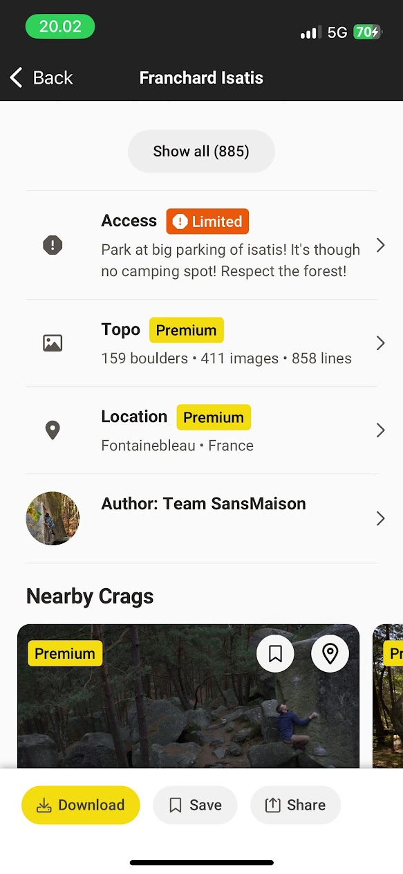 “download, save and share button” have a very prominent position in the fixed button view there - i would not put them there (if i should have something fixed it would be “map”, “topo” and maybe “parking”) - but would prefer no fixed bar there - or the general fixed bar from the frontpage instead!
